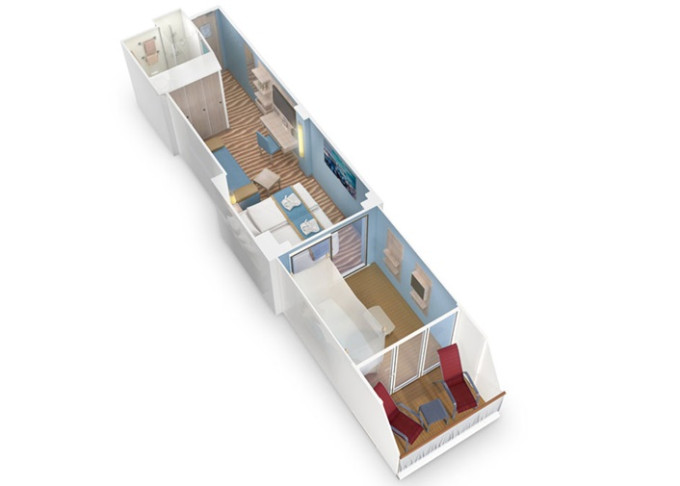 | VA - Kajuta s verandou Komfort PREMIUM 17,5 m² + balkón 5,5 m². 8. až 17. paluba. Max 4 osoby. Cenový model Premium. | 3 950 € 1 975 € za osobu | ||