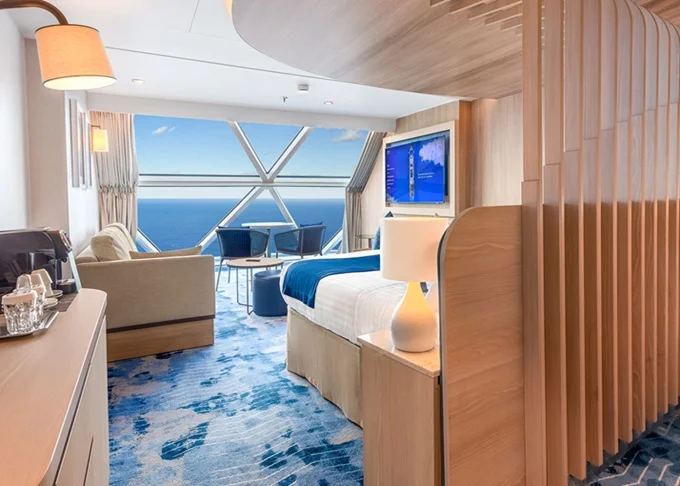VP - Panoramic Suite 38-41 m². Celoplošné panoramatické neotvárateľné okno s výhľadom na more. 16, 17. paluba vpredu. Max 4 osoby. Výhody Suite Sky Class. 11 021 € 11 021 € za osobu