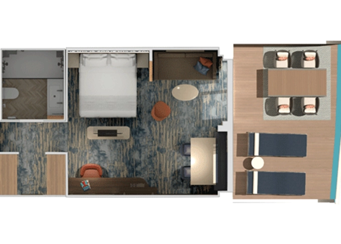 | HU - Suite Havana Cabana Corner 33 m² + vonkajšie rohové patio 15 m². 8. paluba vpredu. Max 3 osoby. Tropický štýl, vstup do exkluzívnej zóny Havana. Výhody Suite. | 5 138 € 2 569 € za osobu | ||