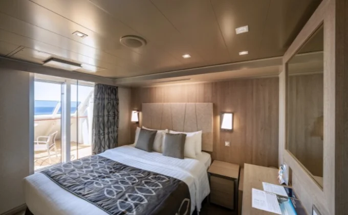 Suite s balkónom: cca 31m² kajuta s manželskou posteľou (na požiadanie 2 oddelené postele) a rozkladacia pohovka. Klimatizácia, kúpeľňa s vaňou, toaletný stolík, priestorná skriňa, interaktívna TV, telefón, minibar, sejf, sušič na vlasy. Balkón so stolíkom a stoličkami. Internetové pripojenie (za poplatok).